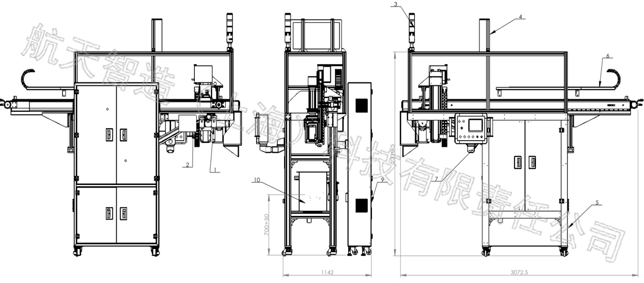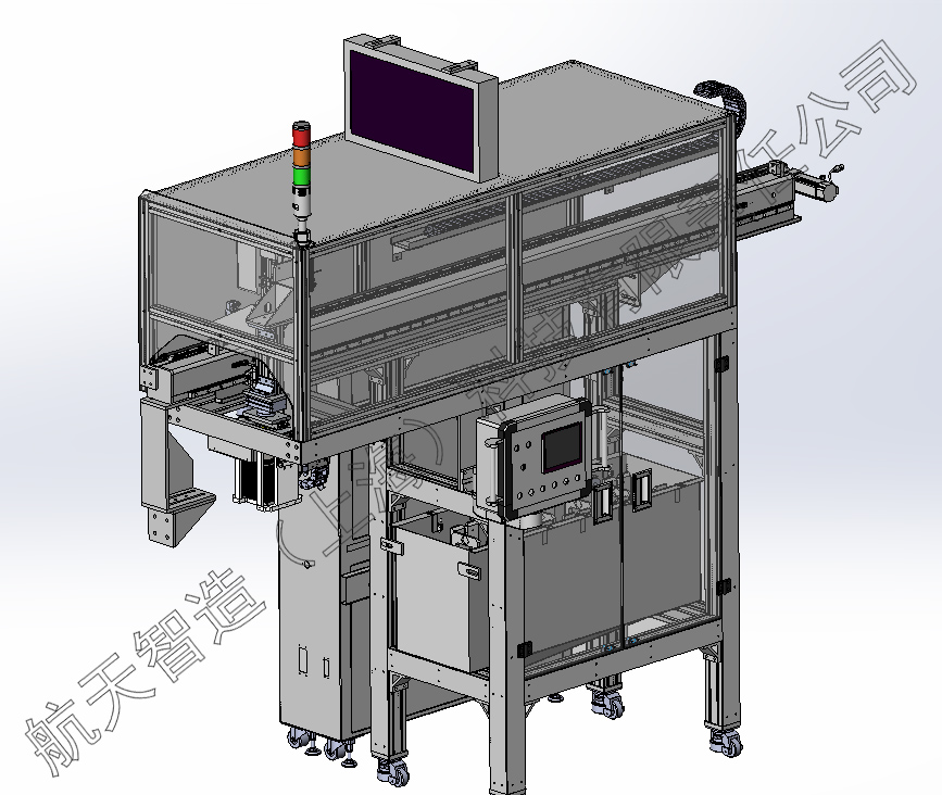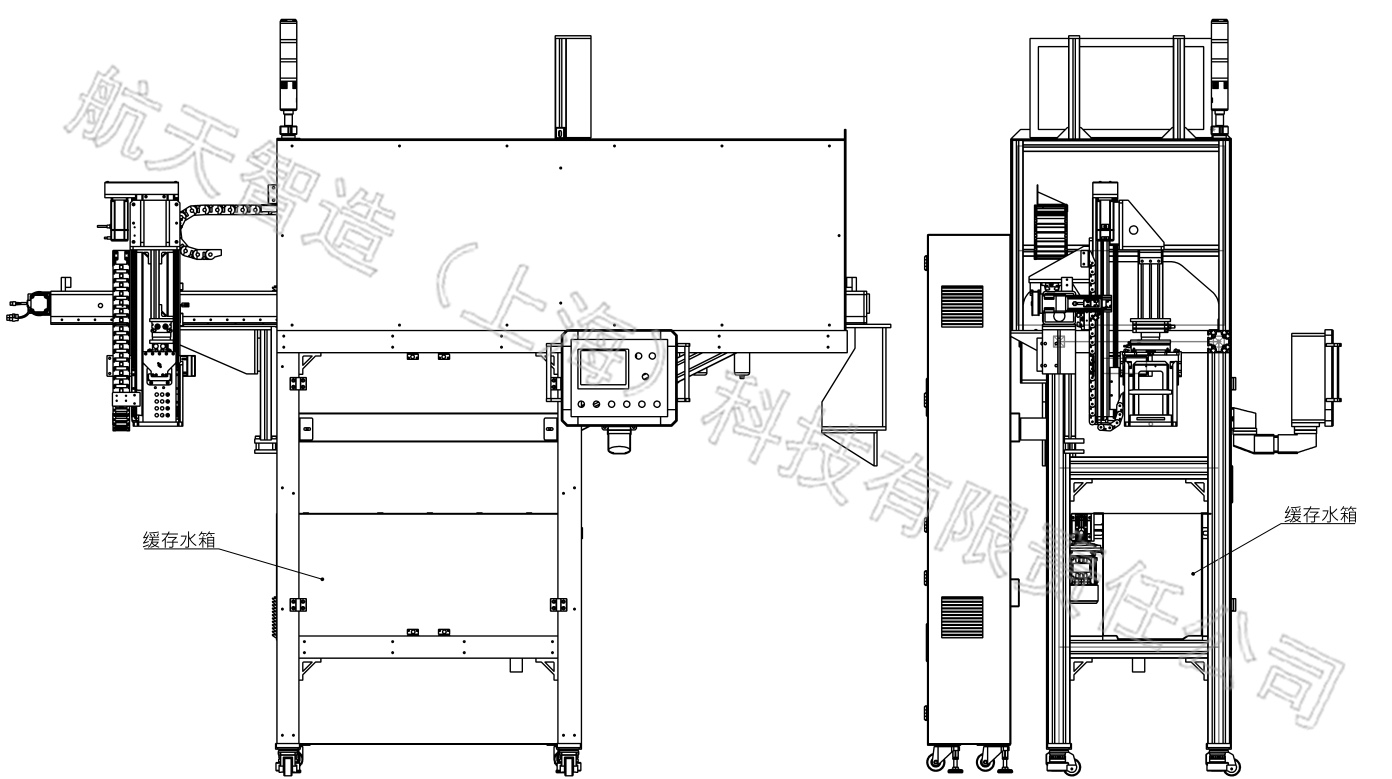 硅片單片很薄、堅硬、脆,考慮工況水質(zhì)浸泡的環(huán)境治具要變形小。治具材料采用硬PVC材料阻燃,硬度高,韌性好,吸濕小。按8寸硅片尺寸設(shè)計內(nèi)框限位,單邊放4mm間隙。承載量為800片硅片設(shè)計治具高度和承載力,安裝板螺紋底孔內(nèi)嵌螺紋鋼套。底板設(shè)計清洗分片機的定位孔,入口孔帶倒角方便引導(dǎo)。底板四角設(shè)計內(nèi)圓弧角,用于前后治具跟進時的隔斷。左右側(cè)板設(shè)計機械手抓取前的限位導(dǎo)向,當機械手下降時自動導(dǎo)正治具后到位抓取。斜度板設(shè)計角度符合清洗分片的角度。抓板設(shè)計同時滿足人工和機械手搬運。后板設(shè)計要挖空,方便人工放置硅片操作。后板并設(shè)計有RFID芯片安裝位。 圖二硅片載體治具示意圖 1.底板 2.側(cè)板3.斜度板4.抓板5.后板 機械手設(shè)計 機械手系統(tǒng)由氣動控制組件、接線盒、三色燈報警器、LED顯示器、機架框架、機械手桁架組件、觸摸屏控制組件、保護罩殼、控制電箱、治具緩存水箱組成。如圖三所示。氣動控制組件和接線盒方便于能源接入。三色燈報警器時時動態(tài)顯示設(shè)備狀態(tài),便于維護。LED顯示器主要顯示設(shè)備的料號信息。機架框架設(shè)計滿足機械手桁架組件和治具緩存水箱的安裝和承載??蚣苤С懈叨燃骖櫇M載治具輸送、治具緩存水箱、清洗分片位、空治具回流輸送功能需求。機械手桁架組件設(shè)計滿足硅片滿載治具的輸送、緩存、清洗分片位的上料、空治具回的流橫移和上下料的承載、行程。觸摸屏控制組件設(shè)計有自動和手動模式,方便調(diào)試、維護、管理。保護罩殼將機械運動機構(gòu)做安全防護,防止意外。治具緩存水箱設(shè)計防止一刀料全部到齊,造成輸送線體堵車作為緩存。緩存位物料少于2件時啟動叫料考慮中間環(huán)節(jié)備料時間。 圖三機械手系統(tǒng)示意圖 1.氣動控制組件2.接線盒3.三色燈報警器4.LED顯示器5.機架框架6.機械手桁架組件7.觸摸屏控制組件8.保護罩殼9.控制電箱10治具緩存水箱 (1)桁架機械手組件設(shè)計 桁架機械手由橫移移栽模組、垂直移栽模組、機械手組件、拖鏈組件、接線盒組成。如圖四所示。橫移移栽模組行程滿足現(xiàn)場布局,移栽橫移位涉及滿載治具輸送、治具緩存水箱、清洗分片位、空治具回流輸送的精確位置,采用伺服電機驅(qū)動。移載行程范圍內(nèi)設(shè)計零點、左右兩邊的極限位、中間設(shè)置加減速感應(yīng)位。橫梁采用型材鋼結(jié)構(gòu),導(dǎo)軌安裝為T型安裝方式,安裝面貼板焊接加工保持平行度和垂直度。移栽極限位設(shè)計機械硬限位。牽引方式采用皮帶。 圖四桁架機械手示意圖 1.橫移移栽模組2.垂直移栽模組3.機械手組件4.拖鏈組件5.接線盒 垂直移栽模組高度行程涉及滿載治具輸送、治具緩存水箱、清洗分片上料位、空治具回流輸送系統(tǒng)。設(shè)計時除清洗分片上料位高度外,其余高度設(shè)計一致。高度的行程以最低點容許富余量50mm。由于高度不同垂直提升采用抱閘伺服電機驅(qū)動。提升機構(gòu)設(shè)計為導(dǎo)軌滑塊和滾珠絲桿方式。移載行程范圍內(nèi)設(shè)計零點、上下兩邊的極限位、中間設(shè)置加減速感應(yīng)位。 (2)治具緩存水箱設(shè)計 治具緩存水箱放置在機械手橫移框架內(nèi)并固定。如圖五所示。緩存水箱的線體中心位置與機械手移載中心位置重合。機械手將輸送線體的滿載治具緩存在水箱中。治具緩存水箱由水箱本體、水下輸送線體、物料檢測、截停機構(gòu)組成。 圖五緩存水箱安裝位示意圖 水箱材料采用不銹鋼鈑金,拼接焊接而成密封不能漏水。水箱設(shè)計有進水口和排水口方便水定時更換且設(shè)有液位傳感器。水箱外有與框架固定的安裝板。水箱內(nèi)安裝有輸送線體,用于輸送治具。水箱上料位設(shè)計有料感應(yīng),感應(yīng)有料啟動輸送。水箱內(nèi)可以緩存4個治具位置加1個放料位滿足5個治具位置尺寸空間。每處位置都有有料感應(yīng),防止?jié)M料放料或疊料。輸送前端設(shè)計有截停機構(gòu),當治具到上料抓取位時截停機構(gòu)啟動阻斷緊跟后面的治具,防止抓取提升帶起。 圖六緩存水箱結(jié)構(gòu)示意圖 1.水箱本體2.水下輸送線體3.治具4.輸送驅(qū)動5.物料檢測6.截停機構(gòu)治具 03 推 廣 前 景 和 結(jié) 論 本文設(shè)計的一款硅片載體治具自動上料機械手,在整體車間13條清洗線實施后,硅片脫膠和清洗前的分裝、搬運、分配、上料環(huán)節(jié)中實現(xiàn)了僅在硅片脫膠后往治具分裝硅片需人工作業(yè),大大減輕了勞動強度。不同型號的硅片清洗對應(yīng)的不同清洗設(shè)備可以在產(chǎn)線中實現(xiàn)自動分線混洗。清洗分片缺料前實現(xiàn)提前預(yù)警,準備備料避免設(shè)備停機提高產(chǎn)能。在批量生產(chǎn)的光伏產(chǎn)業(yè)現(xiàn)狀下,自動化生產(chǎn)是必然趨勢。清洗機上下料機械手改善員工作業(yè)環(huán)境,提高產(chǎn)品合格率、提升生產(chǎn)率。在原有設(shè)備運行的基礎(chǔ)上又在新上清洗機設(shè)備前加裝了20套該上料機械手,所以在上訴環(huán)節(jié)具有行業(yè)推廣意義。