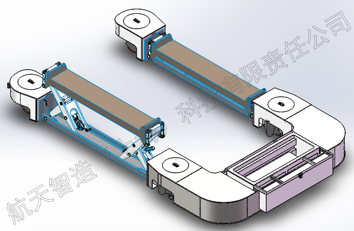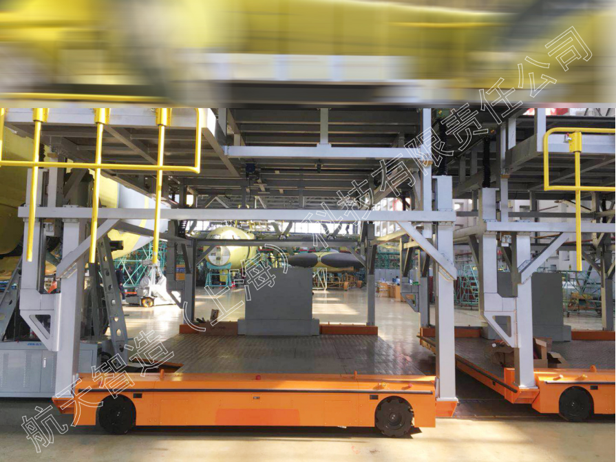機(jī)塢AGV平臺的設(shè)計(jì)制造可以滿足飛機(jī)總裝生產(chǎn)過程中,機(jī)頭、機(jī)身、機(jī)翼及尾段各部位的安裝工作,為操作人員提供高空作業(yè)工作平臺,根據(jù)工作需要電控移動和改變升降高度對整機(jī)進(jìn)行工作平臺的設(shè)計(jì);整體工作平臺分為:雷達(dá)艙工作梯、風(fēng)擋雨刷工作、機(jī)翼工作平臺、尾段工作平臺、罩體工作平臺、前登機(jī)門工作、前應(yīng)急門登機(jī)、后登機(jī)門登機(jī)、起落架工作梯、機(jī)艙內(nèi)工作梯,所有工作平臺入位后對合包圍飛機(jī),機(jī)翼平臺分為三段,采用我司自主研發(fā)的三車聯(lián)動控制來實(shí)現(xiàn)整體或分段的移動,平臺上集成生產(chǎn)用工具、物料放置架、生產(chǎn)所需動力源、數(shù)據(jù)源接口、垃圾投放通道等功能。大翼和尾段工作平臺采用全向輪移動,所有工作平臺根據(jù)現(xiàn)有廠房尺寸合理布局,能快速移動,方便飛機(jī)進(jìn)出機(jī)庫。